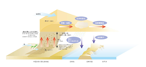 黄砂とは中国大陸内陸部の砂漠、ゴビ砂漠や黄土高原など、乾燥・半乾燥地域で、風によって数千メートルの高度にまで巻き上げられた土壌・鉱物粒子が偏西風に乗って日本に飛来し、大気中に浮遊あるいは降下する現象といわれております。
