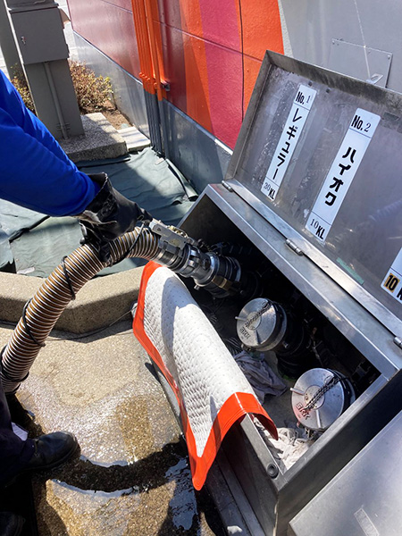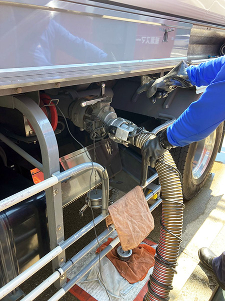 運ばれてきた燃料は、ガソリンスタンドの地下にある貯蔵タンクにタンクローリーからホースを使って移します。