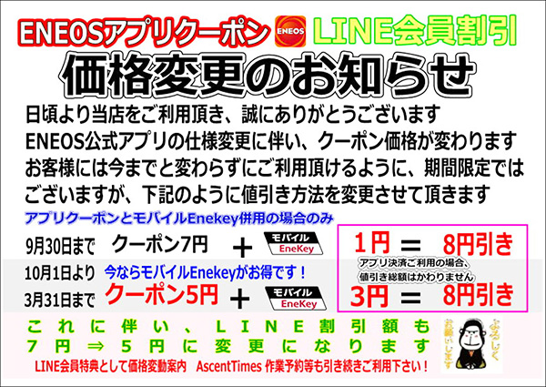 今までは、ENEOS公式アプリクーポンとLINE割引で7円引きでしたが、10月1日より、ENEOS公式アプリの仕様変更に伴い割引額に5円という制限がかかり、変更になりました。