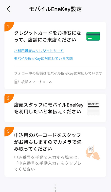 ④ ENEOS公式アプリを起動してモバイルEnekeyの設定をタップして、発行したレシートをスマホのカメラでバーコードを読み取り、お客様情報を入力したら終了です。