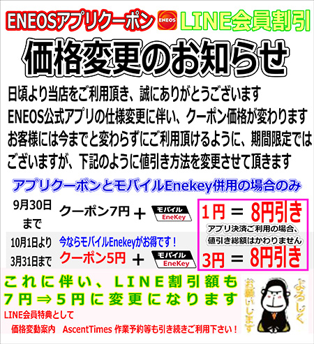 9月下旬から計量機とLINEVOOMで【ENEOSアプリクーポンの価格変更のお知らせ】をご案内させていただきましたが、10月1日からはENEOS公式アプリの仕様変更に伴い、割引クーポンで設定できる最大の割引が5円までしか設定できなくなってしまったことで、当店から配信しているクーポンの割引が【7円⇒5円】に変更になりました。