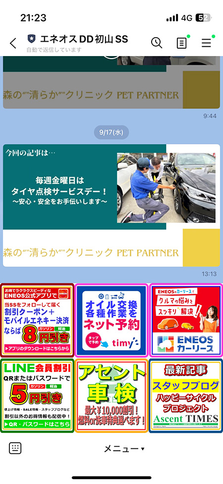 割引金額は変更になりましたが、今後もLINE会員特典・価格変動案内・作業のご予約(timy)などもLINEからご利用できますので、すでにお友達登録がお済みの方は継続してお友達のままでいてくださいね♪