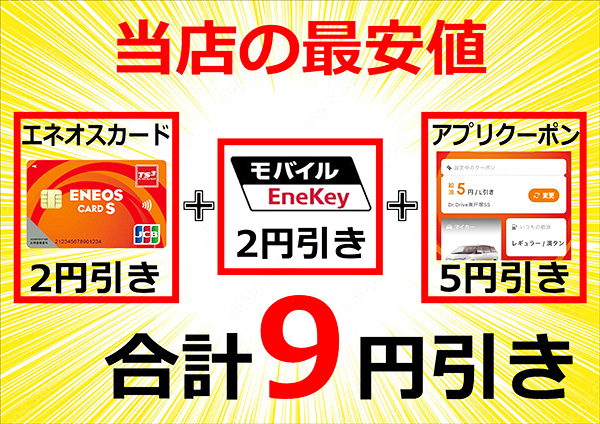 まず初めに「ENEOSカード(クレジットカード)」を作っていただき「モバイルEnekey」に登録をして「ENEOS公式アプリクーポン」をご利用いただく組み合わせが当店の最安値(*^_^*)