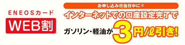 今ならWEBサイトよりENEOSカード(C・P・S)にお申し込みいただき、お申し込み日当日中にインターネットでの口座設定完了で、ご入会翌月から3カ月間、給油料金が合計100Lまで3円/L割引になります!