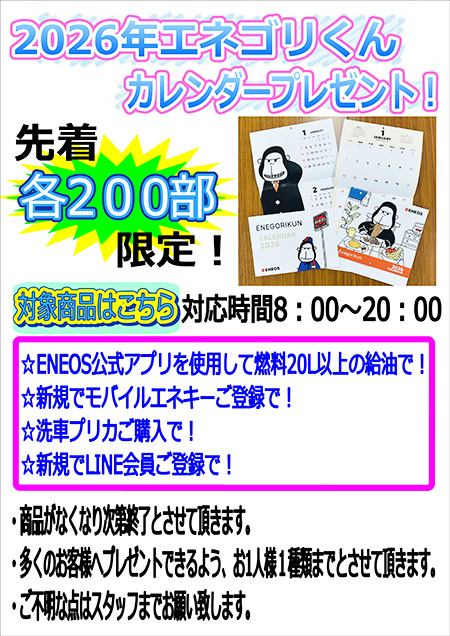 今年はENEOSオリジナルの2026年エネゴリ君カレンダーを2種類ご用意させていただきました♪