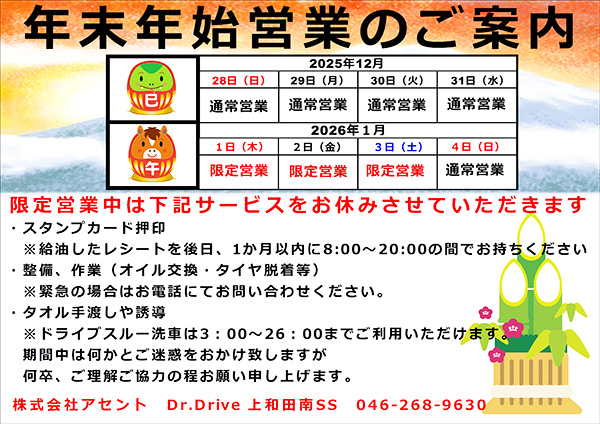12月31日までは通常営業となりますが、年明け正月三賀日は、いつもより少人数での体制になりますのでサービス限定営業という形になります。
