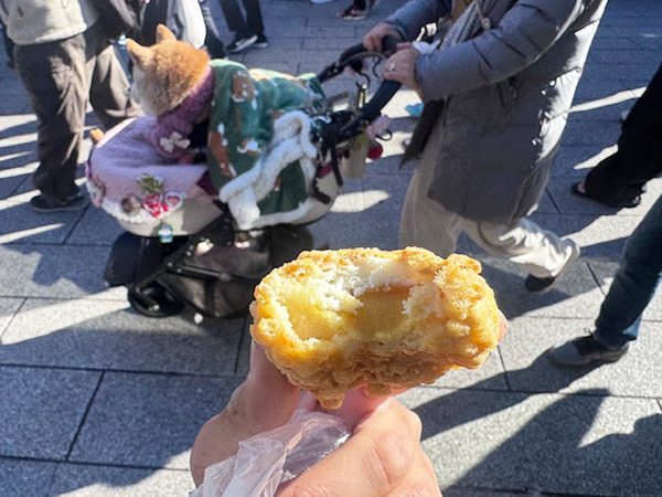 初詣も終わり小腹も空いてきましたので仲見世通りに戻り、美味しそうな物を探していると、「揚げ饅頭」というものを見つけさっそく買って食べてみました。