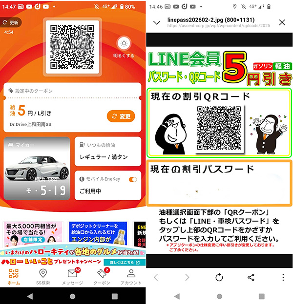 1つは「ENEOS公式アプリクーポン(5円引き)+モバイルEneKey(3円引き・2026年3月31日まで)をご利用いただいた場合の割引価格(8円引き・2026年3月31日まで)」もう1つは「LINE会員割引(5円引き)をご利用いただいた場合の割引価格」となっています。