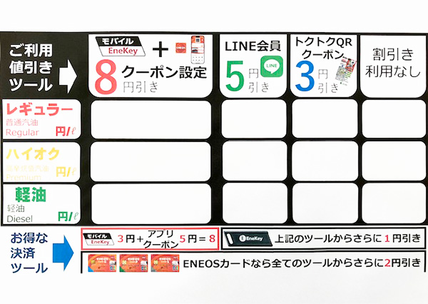 左側2列は副看板と同じENEOS公式アプリクーポン+モバイルEneKeyとLINE会員の割引価格となっております。
