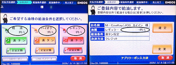みなさんお得な割引ツールをご利用いただいている方が多いと思いますので、ちゃんと設定ができているか価格看板や価格表を見て今現在(給油時)の価格を確認の上、タッチパネルで操作する際に割引での価格になっているかどうか確認していただければと思います。