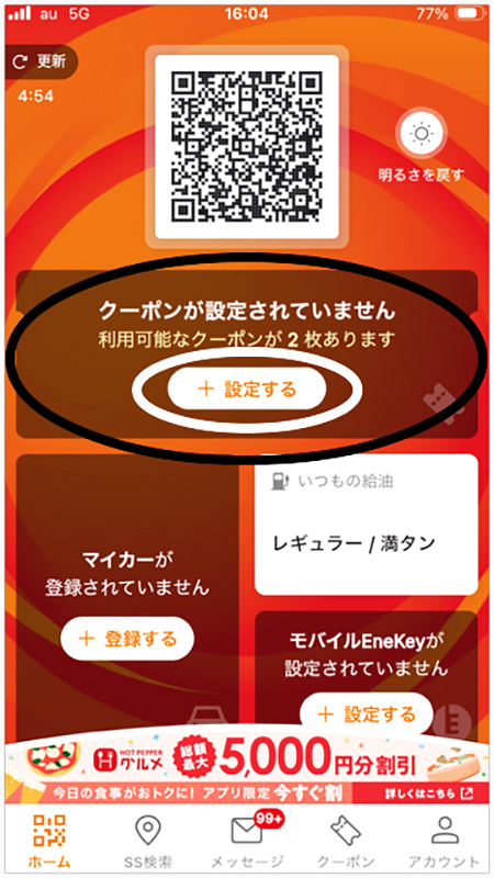 上の写真のようにクーポンが設定されていない状態の時は「+設定する」の部分をタッチしていただき、上和田南SSのクーポンを設定してください!