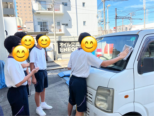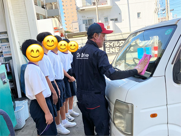 もちろんお客様へは職業体験の旨を伝え、許可をいただき、実際のお車で窓ふきを実践してもらいました。