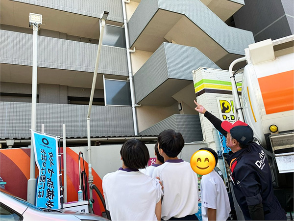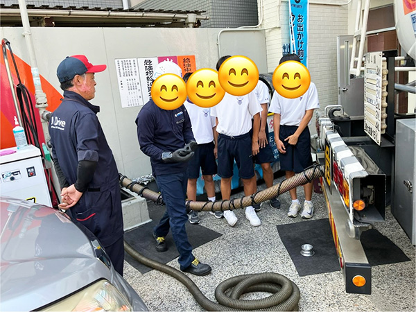 その後、ちょうどタンクローリーの受け入れ時間と重なったため、タンクローリーのドライバーさんにもご協力をいただき、説明を受けながら荷下ろしの見学をさせていただきました。