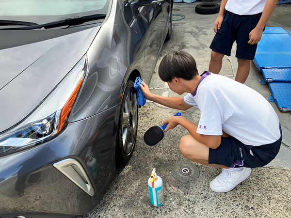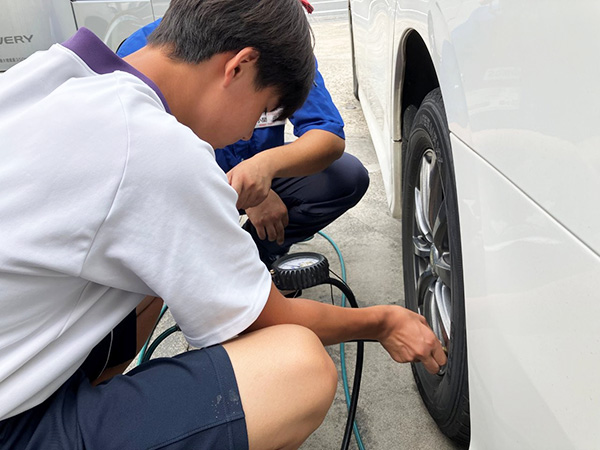そして作業として、タイヤの空気圧の点検・洗車の拭き上げを体験してもらいました。