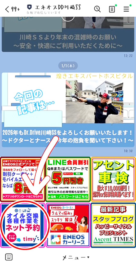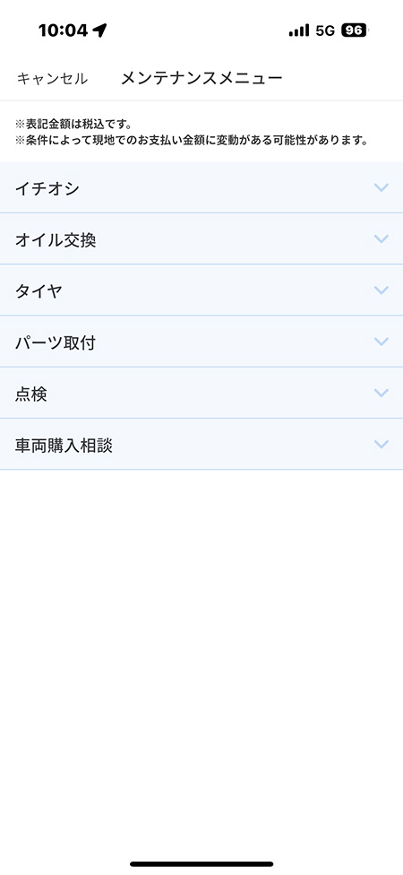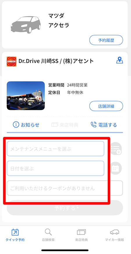 赤枠の部分をタップし、メニューの選択と作業予約日時を決めてください!