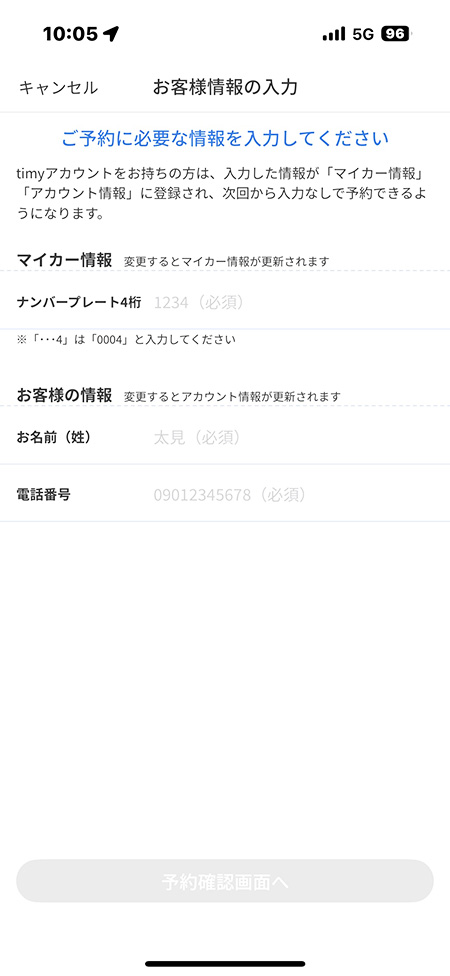 メニューと作業日時を確定後、お車のナンバー4桁(例 1234、0123、0012)、お名前、電話番号を入力してください!