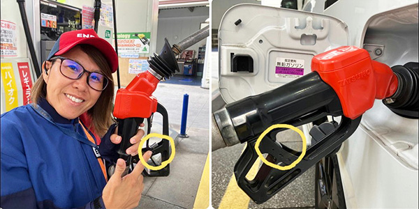 サロンの給油ノズルは、ずっと握っていなくてもガソリンが出るようにロックがかけられるようになっているのですが、給油中にロックをかけ、トイレや自販機に行き、お車にお戻りの際に給油をしていることを忘れてしまい、給油ノズルを差し込んだままお車を発進させてしまうお客様がたまにいらっしゃいます。