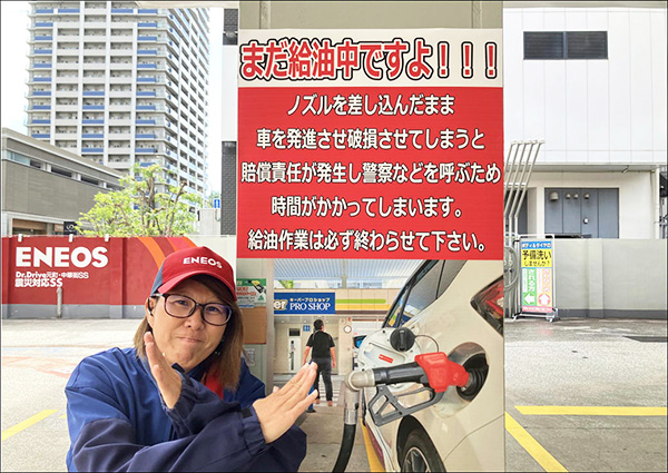 給油ノズルを破損させてしまうと、賠償責任が発生してしまうばかりでなく、警察を呼んだりして時間がかかってしまいますが、何よりもお客様の大事なお車に傷がついてしまうので、給油作業中であることをお忘れにならないよう、必ずご確認をお願いいたします。