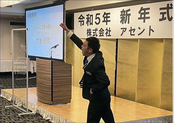 アセントの新年式は、社長をはじめ各部署の皆さんが、年頭の挨拶や今年の方針を発表し、チーム力を高めていくだけでなく、何よりも、いつも頑張って働いているスタッフたちへの感謝と慰労をしたい、という社長の気持ちがいっぱい詰まった大切な行事です。
