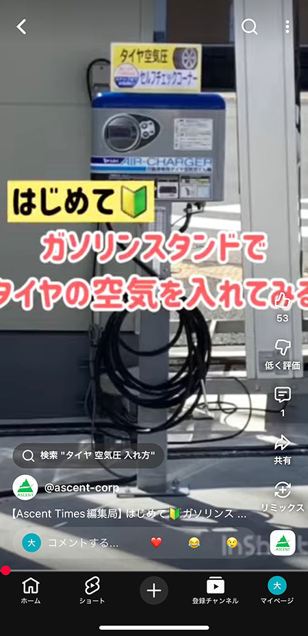特に人気の動画は『はじめて🔰ガソリンスタンドでタイヤの空気圧を入れてみる』