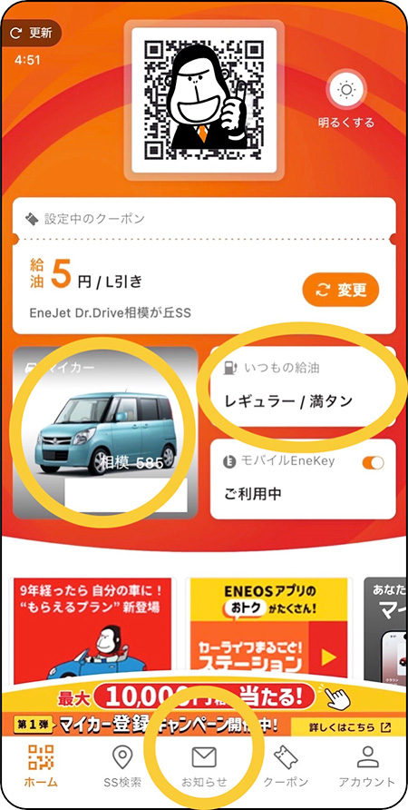 いつもご利用の油種や給油量を登録しておける「いつもの給油」や、愛車の車両情報や車検にまつわる情報も簡単に確認できる「マイカー登録」、ENEOSのキャンペーン、アセントのキャンペーン情報等を送らせていただいている✉「お知らせ」機能もあり、お客さまにお役に立てる機能も入っていますので、ぜひ使っていただきたいと思います☺