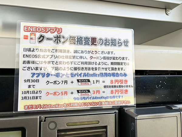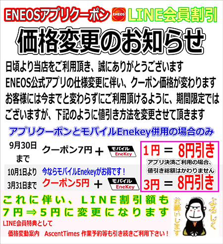 さて!日頃より当劇場をご利用いただいているお客様に、オイルフェアのお知らせだけではなく、10月1日から「ENEOS公式アプリのクーポンの割引額の変更とLINE会員割引の変更」を目一杯ご案内していますがもうご存じですか?
