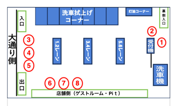 洗車機入口に数台が並ぶことで裏口側(カーサ相模台側)出入口を塞がないように、下の図の赤マル順に2台、3台目以降は離れて並ぶようご案内いたします。