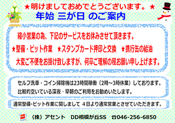 給油、洗車以外のサービスについては3日間お休みさせていただきますので、何卒ご理解のほどよろしくお願いいたします。
