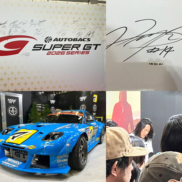 SUPER GTブース「14号車 ENEOS X-PRIME」ドライバー 大嶋和也選手のサインや、「マツキヨ MINI シバタイヤ RE雨宮RX-7」。