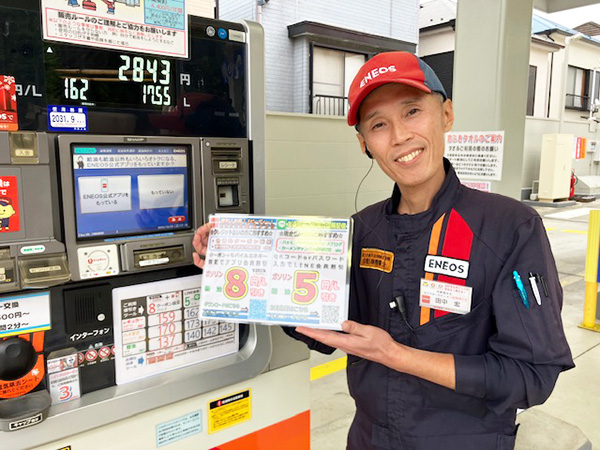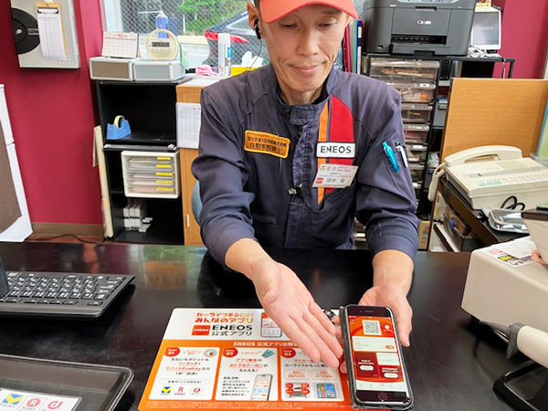 ご登録後はスマホ内のQRコードまたはパスワードを給油機タッチパネルに入力するだけで、5円引きで給油できます。