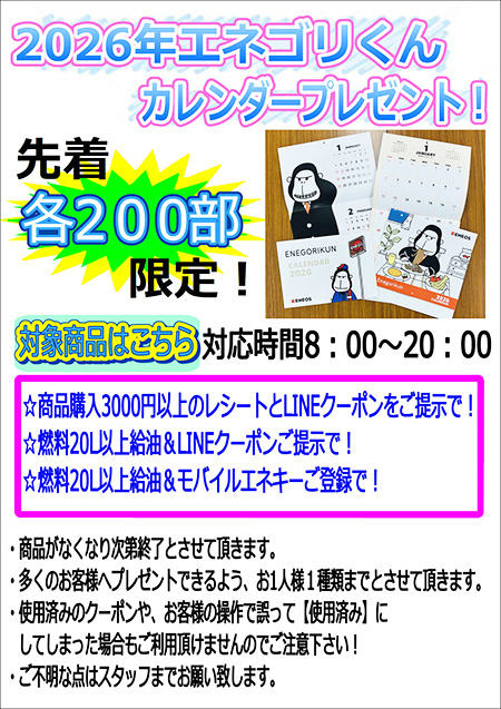 さて、今年も皆様に一年間の感謝の気持ちを込めまして、「2026年エネゴリくんカレンダー」をプレゼントいたします!(^^)!