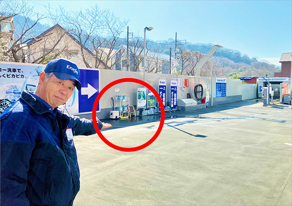予備洗いができる場所は給油スペースから見ると正面の赤丸の場所になります。