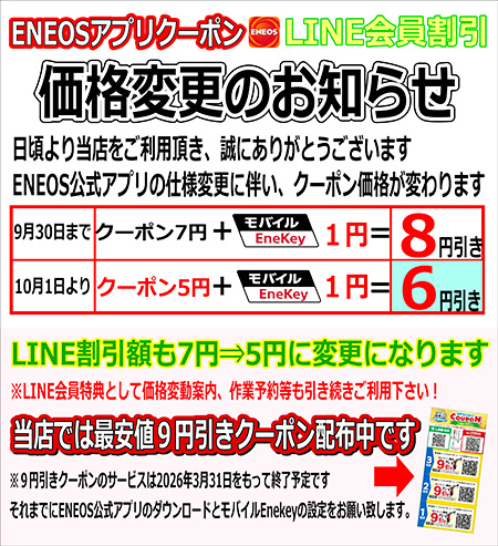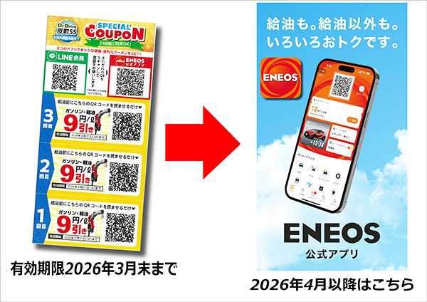 今まで継続して配布してきた9円引きクーポンですが、今回のクーポンの有効期限である2026年3月31日をもって【紙の割引クーポン】は発行終了し、4月1日から【ENEOS公式アプリから配信されるクーポン】に変更予定です!