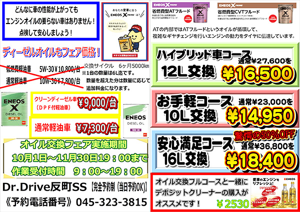 これから行楽シーズンでお出かけされる方、前回5・6月のフェアでオイル交換された方、前回から6ヶ月又は5,000Km以上走行された方、10・11月は「オイルフェア」を開催しております!