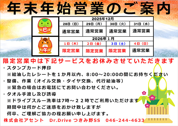 年末は、給油やドライブスルー洗車のご利用で混雑が予想されます。