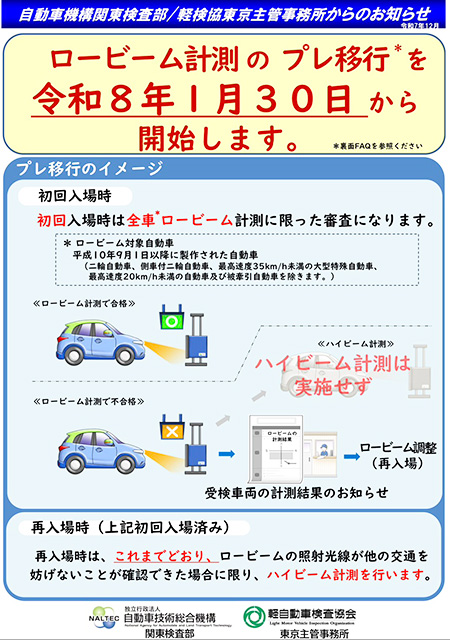 1998年9月1日以降に製造されたお車は、8月以降車検時のヘッドライト検査が「ロービーム(すれ違い用前照灯)のみ」で行われるようになります。